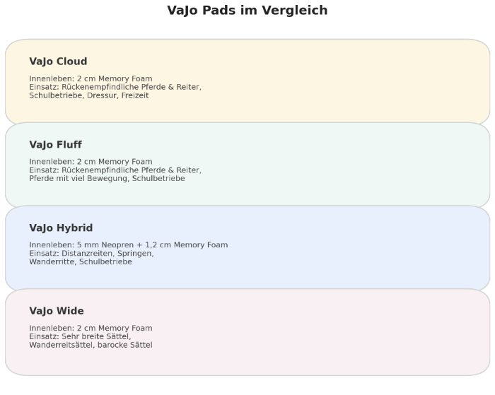 Unsere VaJo Pads unterscheiden sich in Aufbau und Einsatzbereich – vom vielseitigen Einstiegsmodell Cloud bis zur Hybrid für Höchstleistung. Vergleiche die Modelle auf einen Blick und wähle das Pad, das am besten zu dir und deinem Pferd passt.